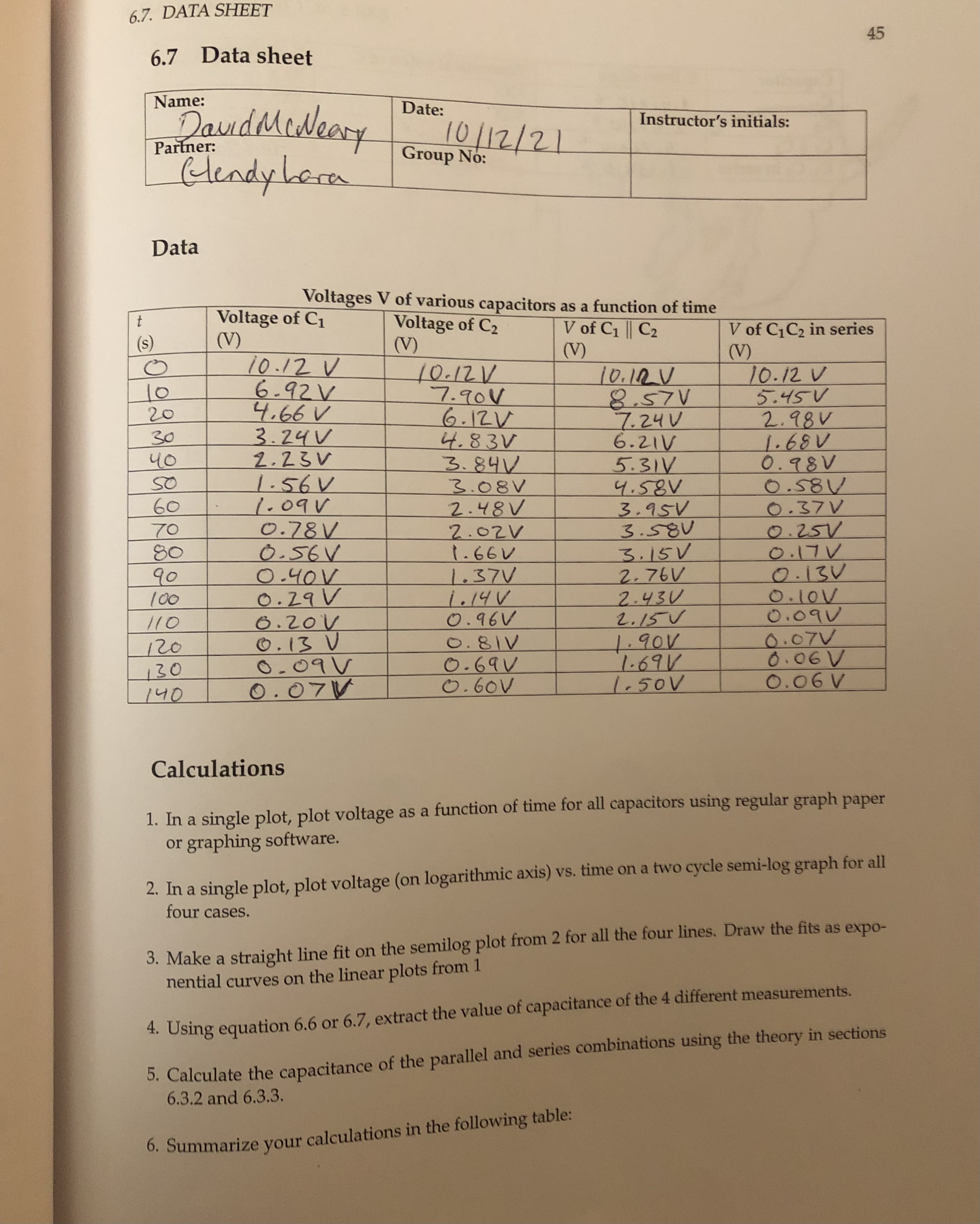| $t$ (seconds) | $V_{C_1}$ (Volts) | $V_{C_2}$ (Volts) | $V_{C_1\parallel C_2}$ (Volts) | $V_{C_1C_2}$ (Volts) |